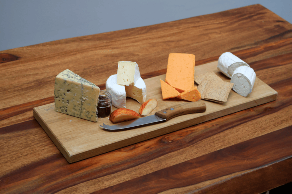 A selection of four delicious cheeses handmade in Lancashire: Button Mill® soft mould ripened cheese; Stratford Blue® full fat soft blue veined cheese; Kidderton Ash® soft mould ripened goats cheese with charcoal ash; and Rothbury Red® Red Leicester cheese.