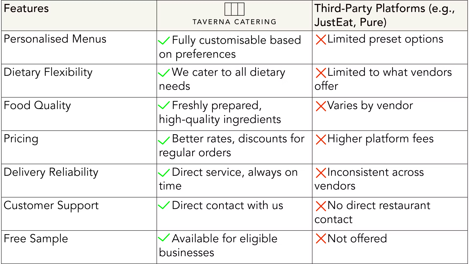 We provide reliable, high-quality catering for offices and corporate clients across London and Kent, offering hot buffet lunches, breakfast deliveries, individually packed meals, and sharing platters. Whether you need a one-time drop-off or a regular catering service, we make it easy—we work around your needs, not the other way around. Unlike third-party platforms, we offer a personalised service, flexible menus, and exclusive discounts for regular clients. For eligible businesses, we also provide a free sample so you can try our food before committing.